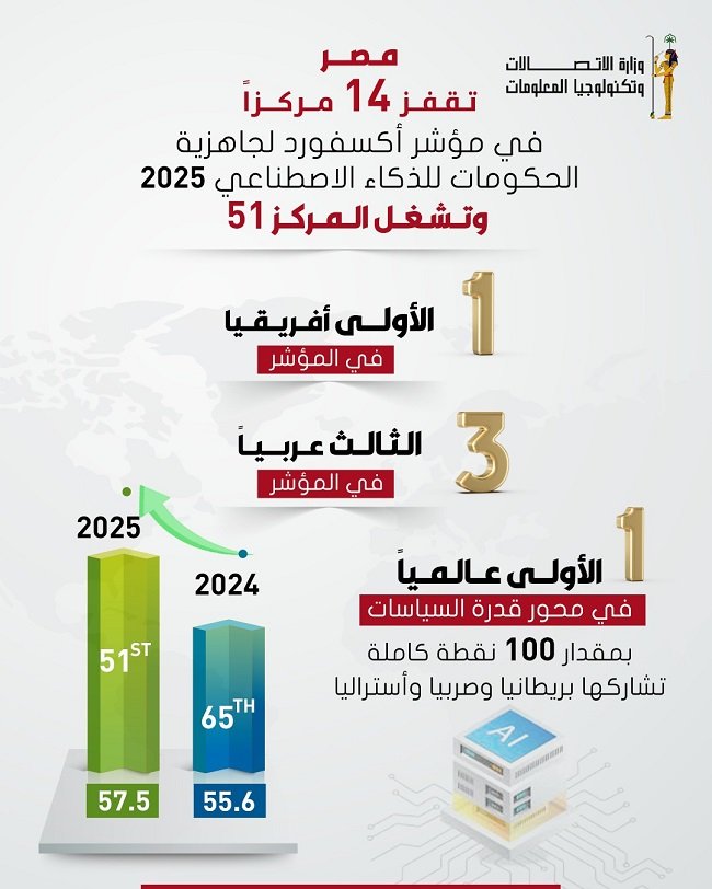 يُذكر أن مصر حققت تقدمًا تراكميًا بلغ 46 مركزًا في مؤشر جاهزية الحكومات للذكاء الاصطناعي خلال الفترة من 2019 إلى 2024، حيث انتقلت من المركز 111 عالميًا في عام 2019 إلى المركز 65 عالميًا في عام 2024، وصولًا إلى المركز 51 عالميًا في نسخة 2025، في مؤشر واضح على مسار تصاعدي ثابت في مجال التحول الرقمي والذكاء الاصطناعي.